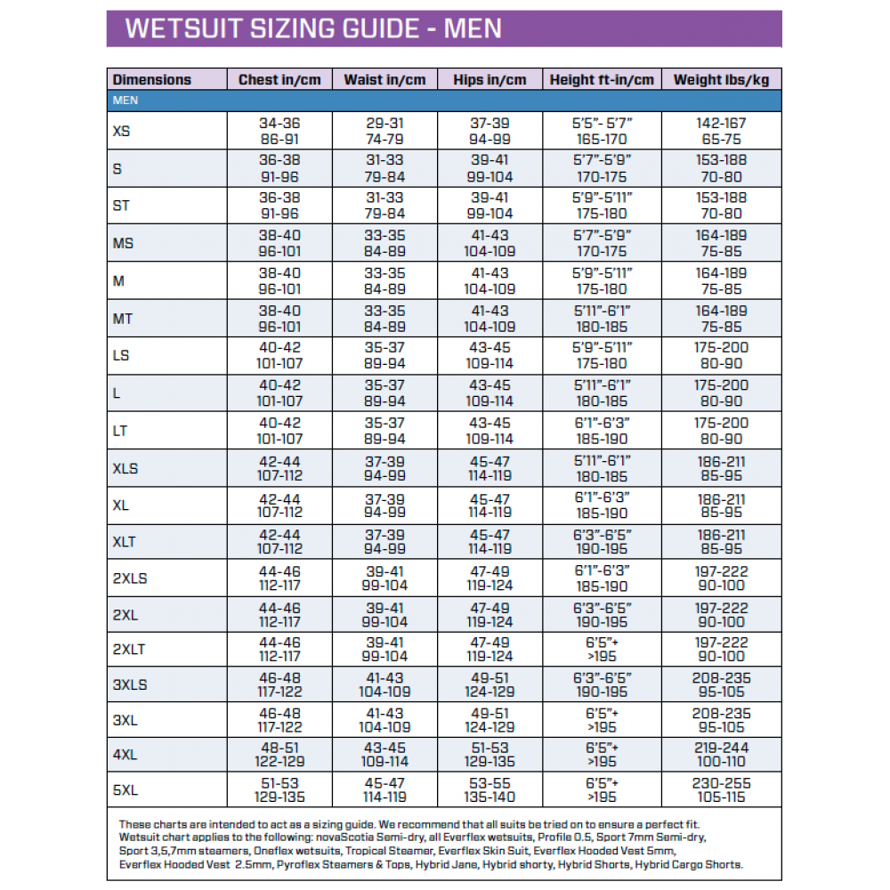 - Same sizing as wetsuits.